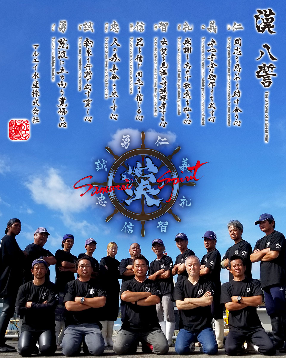 マルエイ水産の信条である「八誓(はっせい)」は、日本古来の良き武士道を見習い、より高い集合意識のために存在します。